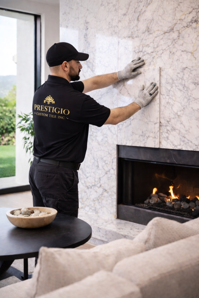 Prestigio Custom Tile Inc. provides professional fireplace tile and slab installation for residential and commercial projects throughout Los Angeles and surrounding Southern California areas. We install fireplace surrounds, full-height slab fireplace walls, feature wall tile, large-format panels, and custom finishing details with a focus on clean layout, precise fabrication, and lasting finish quality.